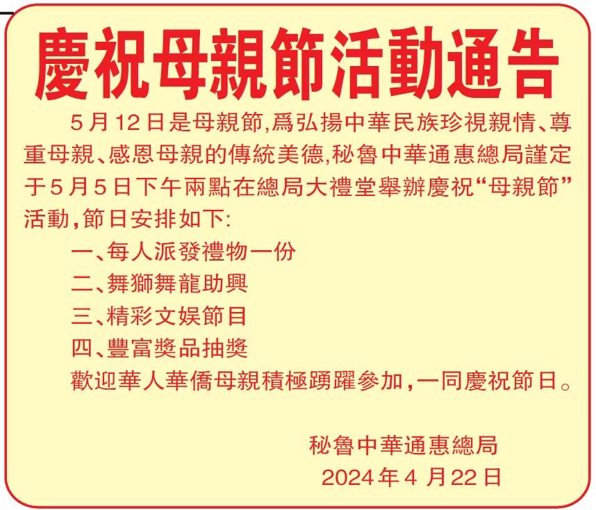 秘鲁中华通惠总局成功举办庆祝母亲节联欢活动